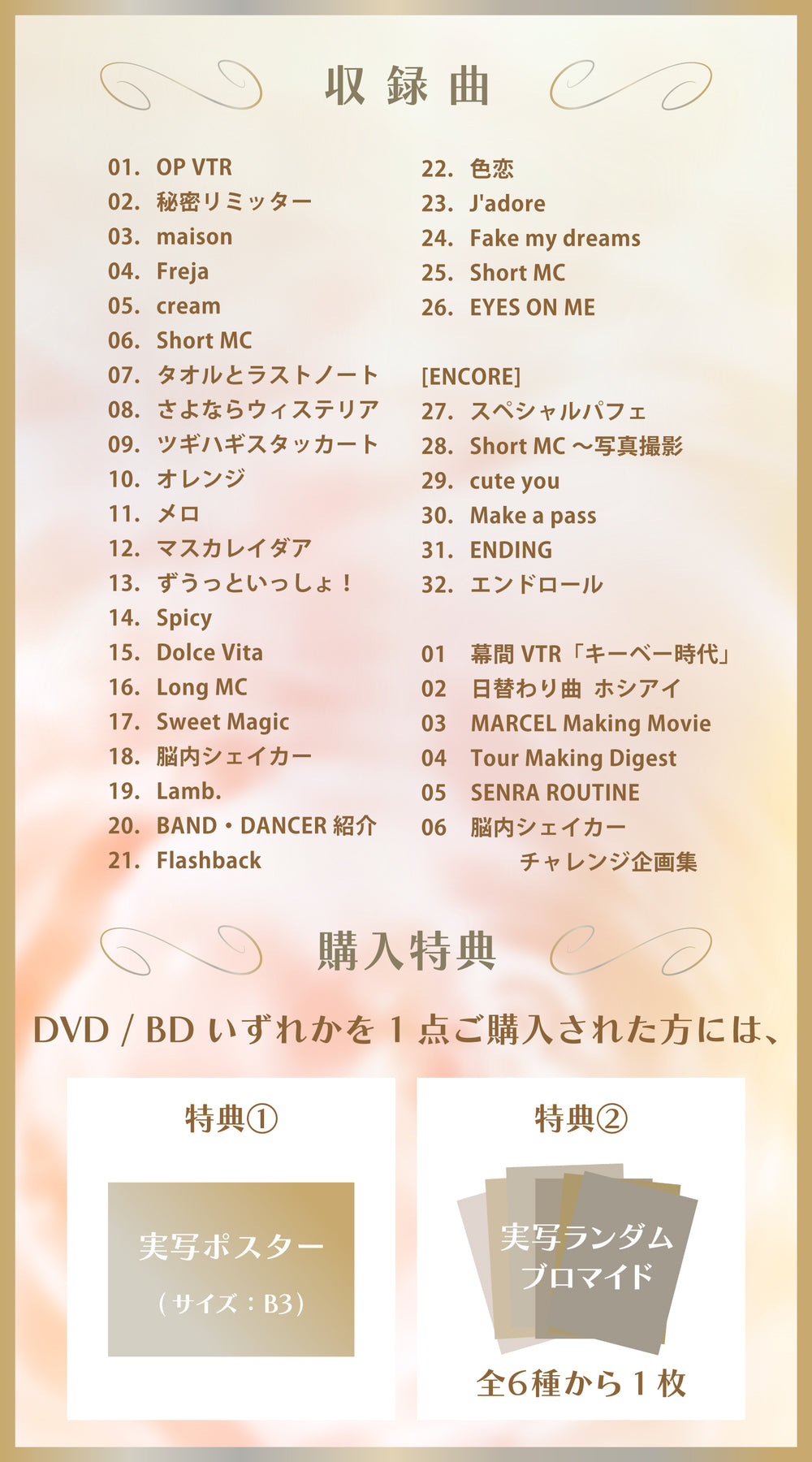 特典映像には、ツアーの裏側やライブ前のルーティンを収めた1時間超の「MARCEL Making Movie〜SENRA ROUTINE」、さらに日替わり曲「ホシアイ」や、注目を集めた「脳内シェイカーチャレンジ集」など、ボリューム満点の内容を収録!