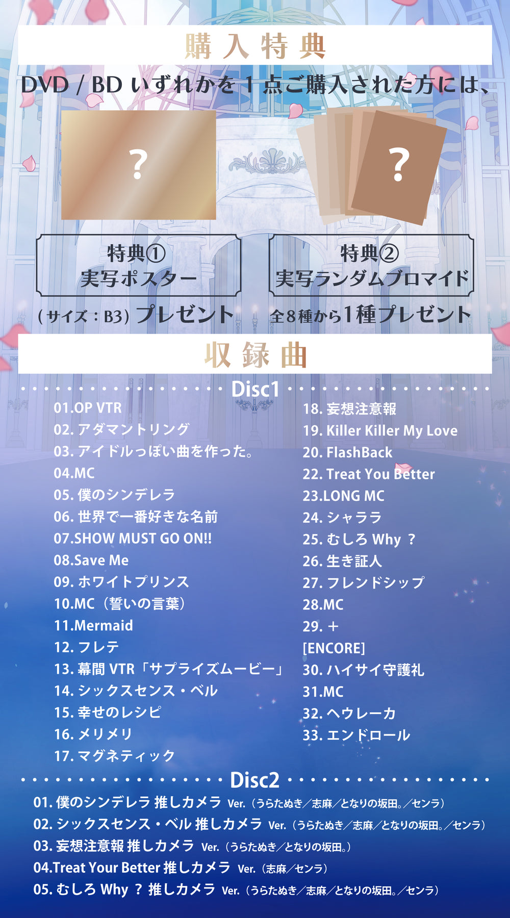 2024年8月3日に開催された「浦島坂田船 SUMMER TOUR 2024 Weddiing」におけるLaLa arena TOKYO-BAYの公演を収録!購入者特典として、1枚購入につき実写ブロマイド(全8種類のうち1種)と特典ポスター(サイズ:B3)を同梱!